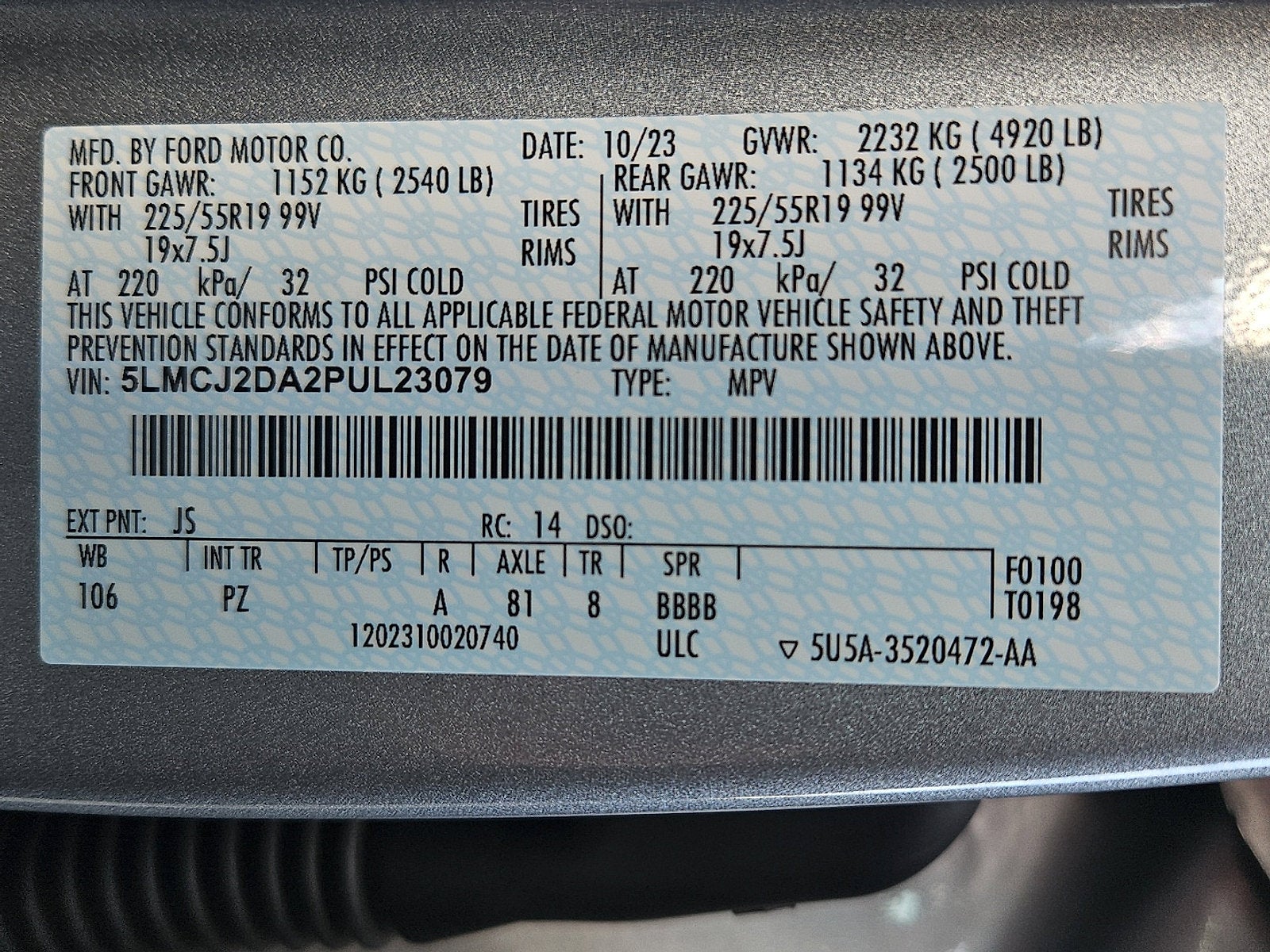 - Front Tire Size: P225/55VR19